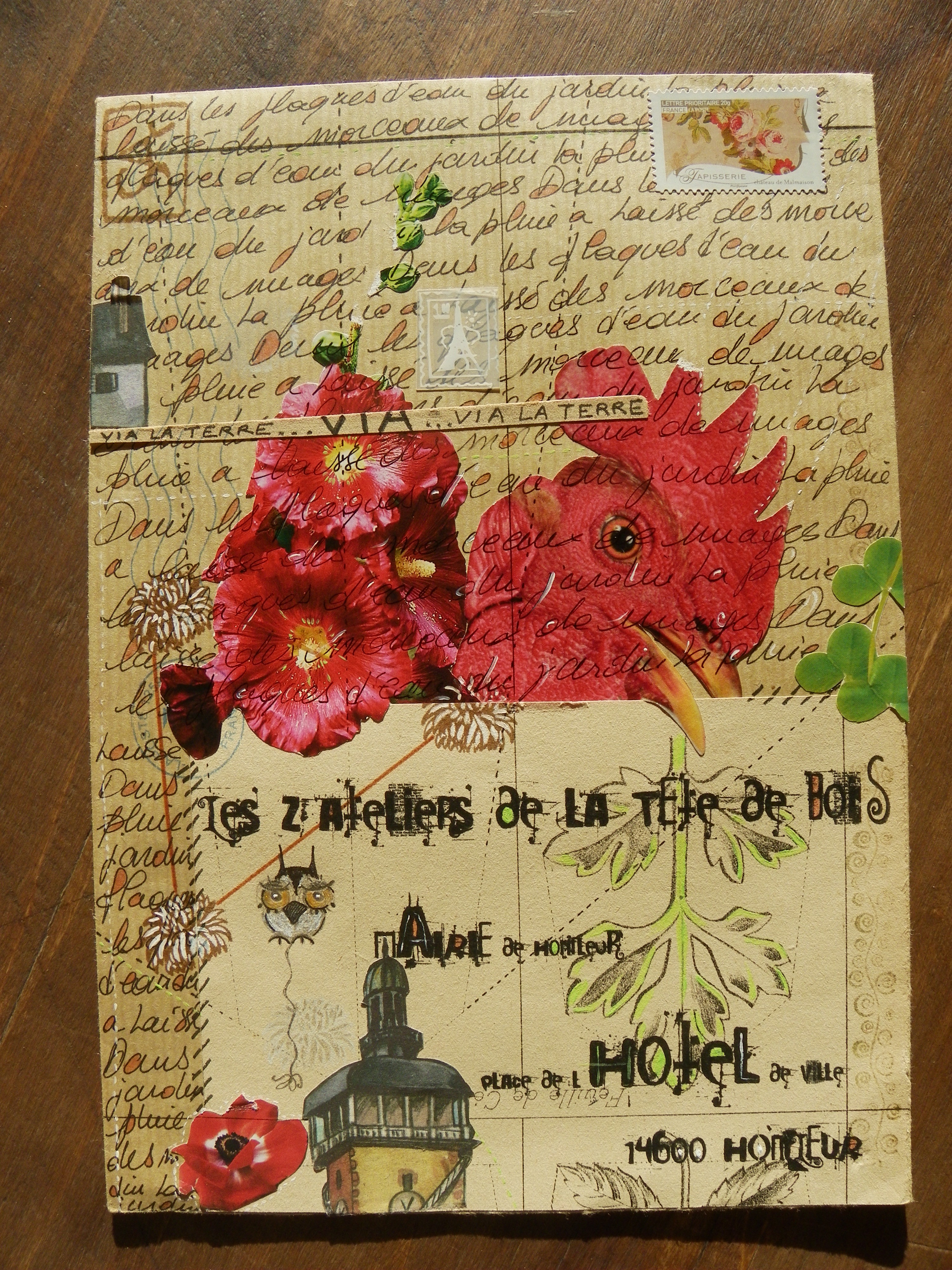 L’an passé, nous avions reçu cette enveloppe de Sophie Alaterre, animatrice de l’ association. Une très belle réalisation où collages, dessins peinture et écriture s’entremêlent.