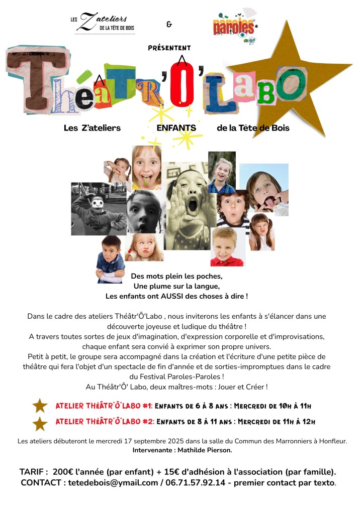 Au sein des Z’Ateliers de la tête de bois, en lien direct avec le festival Paroles paroles, à l’image des ateliers ados et adultes, Mathilde Pierson, comédienne, propose un espace créatif « laboratoire », une expérience théâtrale pour les plus jeunes, un endroit collectif pour s’initier, créer, s’amuser et progresser, un lieu où le mot « troupe » prend tout son sens…